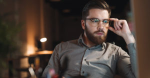 Web designer working late at night and looking to computer